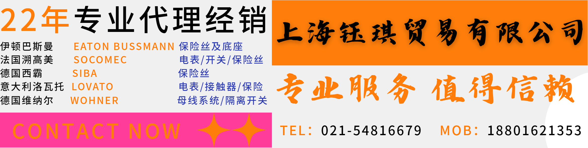 本公司于2005年在上海外高桥注册成立贸易公司,代理国外知名品牌,包括EATON Bussmann , Socomec , Lovato , Panduit , Siba,Wohner,Pilkor 等产品,我们销售符合各国环保要求,及有各国安规认证(UL CSA CE CCC等)的优质产品。